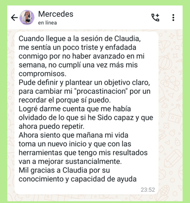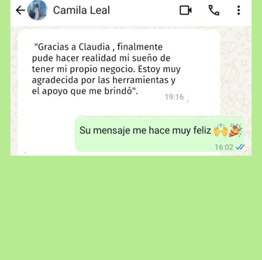 "Soy muy joven y tenia mis sueños, solo que no tenia idea de cómo llevarlos a cabo. Cuando comence a trabajar con Claudia aprendi herramientas y un método y fue cuando todo cambió... Antes no sabía y en mi negocio, todo era un caos. Ahora tengo un sistema que me da paz mental y claridad para decidir en mi negocio. ¡Mi ansiedad se fue!"